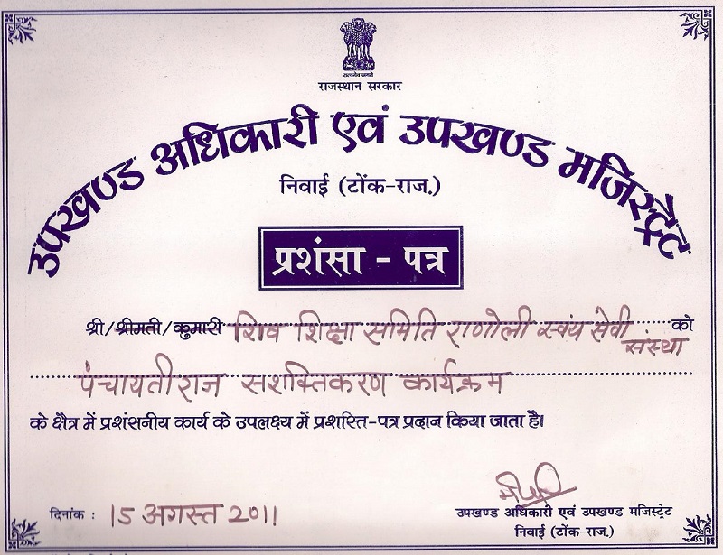 With Financial Support ofUNICEF, Jaipur to Strengthing of PRIs for decentralize planning-Integrated District Approach in 66 Panchayat of Tonk and Niwai Block of Tonk district from May 2010 to December 2012.